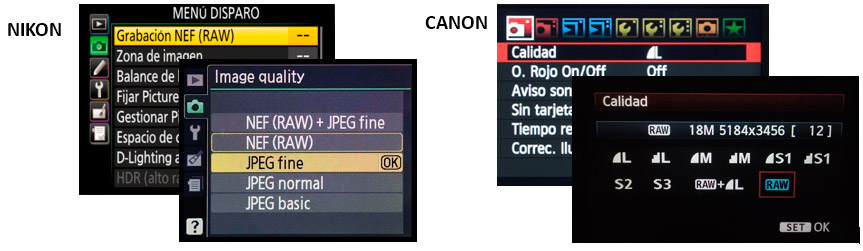 Configura el formato RAW desde el menú de tu cámara.