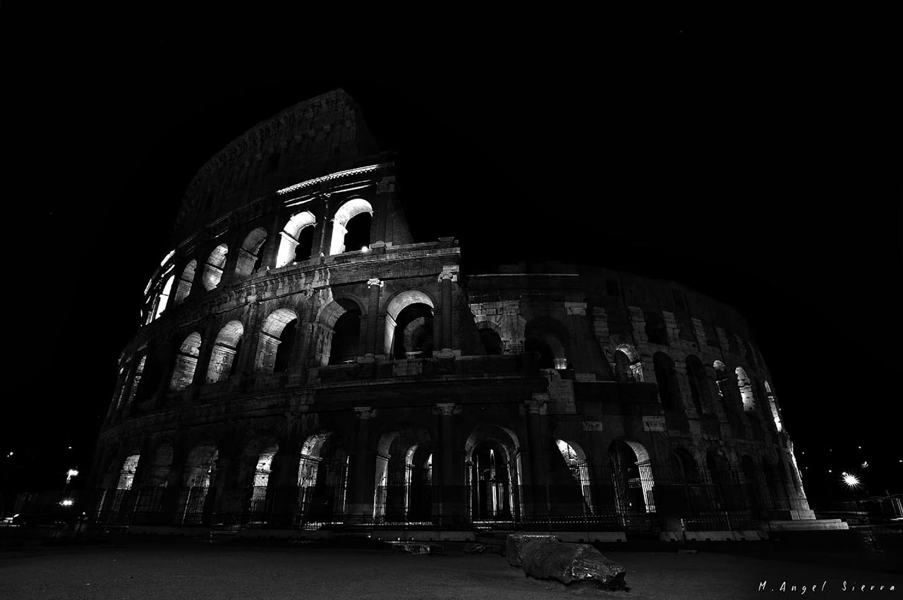 • Miguel Ángel Simarro: Colosseo (Grupo de FB #LaEscuelaDeFotografía). Para mi una imagen a la par de la ganadora. Me parece muy acertado haber expuesto para las luces para ocultar muchos detalles de este emblemático monumento. No he estado en el lugar, pero me imagino que habrá muchas luces en el lugar y controlar la luz será complicado, por eso me parece muy acertada la elección de la exposición. En este caso Miguel Ángel ha optado por la versión en blanco y negro, es fácil que de esa forma pueda quitar el efecto de luces con distinta temperatura de color, pero para este tipo de monumentos, el color si se consigue controlar, también aporte interés. Aunque el blanco y negro no desmerece al aportar un punto más de abstracción. Por comentar algo quizás mejorable, en el primer plano hay cierta iluminación que nos muestra algo, que no identifico y que no creo que aporte mucho. Pero sin ninguna duda, es una  ¡Gran imagen Miguel Ángel! 😉
