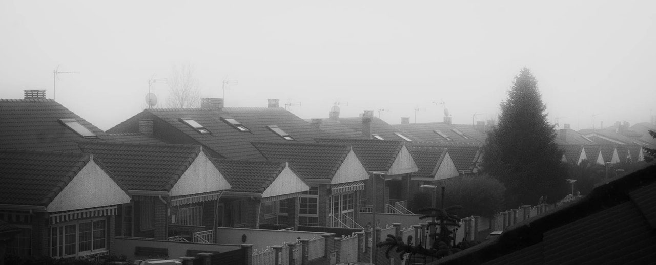 - Eva del Toro: Sin título (Grupo de FB #LaEscuelaDeFotografía). Escribe Eva en su publicación que no sabía bien dónde ver triángulos, y que fijándose un poco, los tenía muy cerquita. Por supuesto ¡Cuántas cosas se nos escapan a diario con nuestra limitada percepción! Y lo mejor ¡Qué interesante es ser consciente de ello e intentar superar esas limitaciones! 😉 Aquí los triángulos llamativos de las construcciones crean un ritmo casi infinito, algo que apoya el formato panorámico de la toma. El blanco y negro y la nieblina que se aprecia en la parte superior aportan algo de misterio y extrañeza a la imagen. Y puestos a participar en esta fiesta de triángulos, hasta el árbol presente y con un tono muy diferenciado del resto, adquiere la forma que buscábamos en el reto… A veces la naturaleza parece alinearse y sólo hay que saber mirar como Eva logró hacer !Estupendo Eva! 🙂