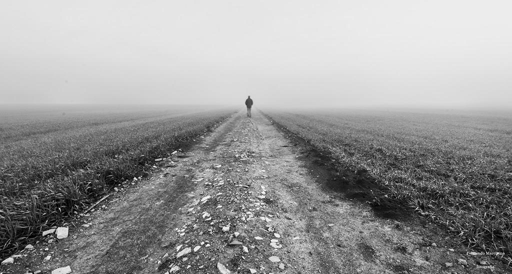 - Fernando Marchena: Sin título (Página de FB #LaEscuelaDeFotografía). Una imagen sencilla que funciona perfectamente y que también podría estar a la par de la ganadora. Las líneas del camino conducen a la persona que parece caminar hacia lo desconocido, hacia el abismo… y naturalmente sola. Tanto el encuadre, el blanco y negro y el momento ambiental ayudan a transmitir la sensación buscada ¡Muy buena imagen Fernando! 😉